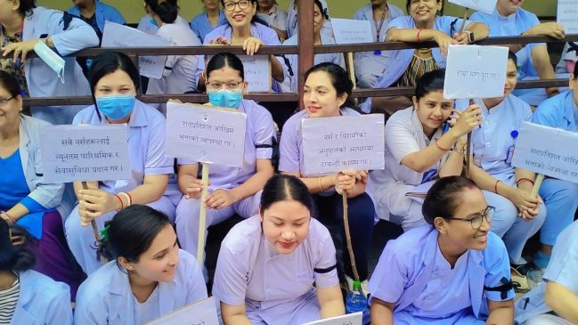 २०८२/ ०७/ ०२ मा नेपाल नर्सिङ संघले पुन पेश गरेको माग पुरा गर्ने सम्बन्धमा स्वास्थ्य तथा जनसंख्या मन्त्रालयले कार्यदल गठन गरेको र उक्त कार्यदलको कार्य अवधि छठ पछि ७ कार्यदिन रहेको र उक्त कार्यदलमा नेपाल नर्सिङ संघको प्रतिनिधित्व रहेको हुदा उक्त कार्यदलको प्रतिवेदन आउने समय सम्म सम्पुर्ण निजि तथा सरकारी स्वास्थ्य संस्थामा गरीने आन्दोलनको कार्यकम यस प्रकार रहको हुदा सोहि अनुसार गर्नु हुन नेपाल नर्सिङ संघ आव्हान गर्दछ ।