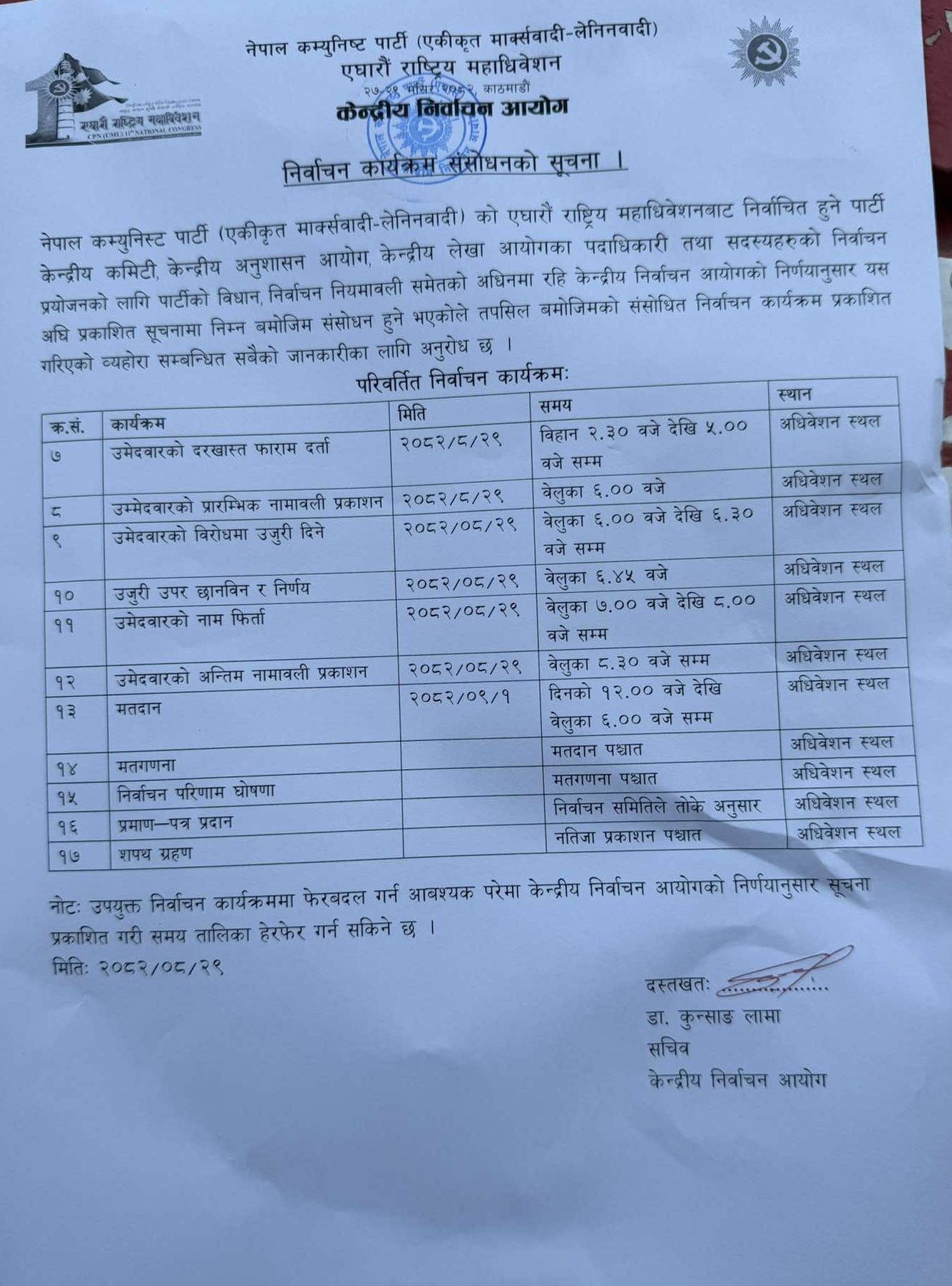 नेकपा एमालेको ११औँ राष्ट्रिय महाधिवेशन अन्तर्गत तय गरिएको कार्यतालिकामा सामान्य हेरफेर गरिएको छ।