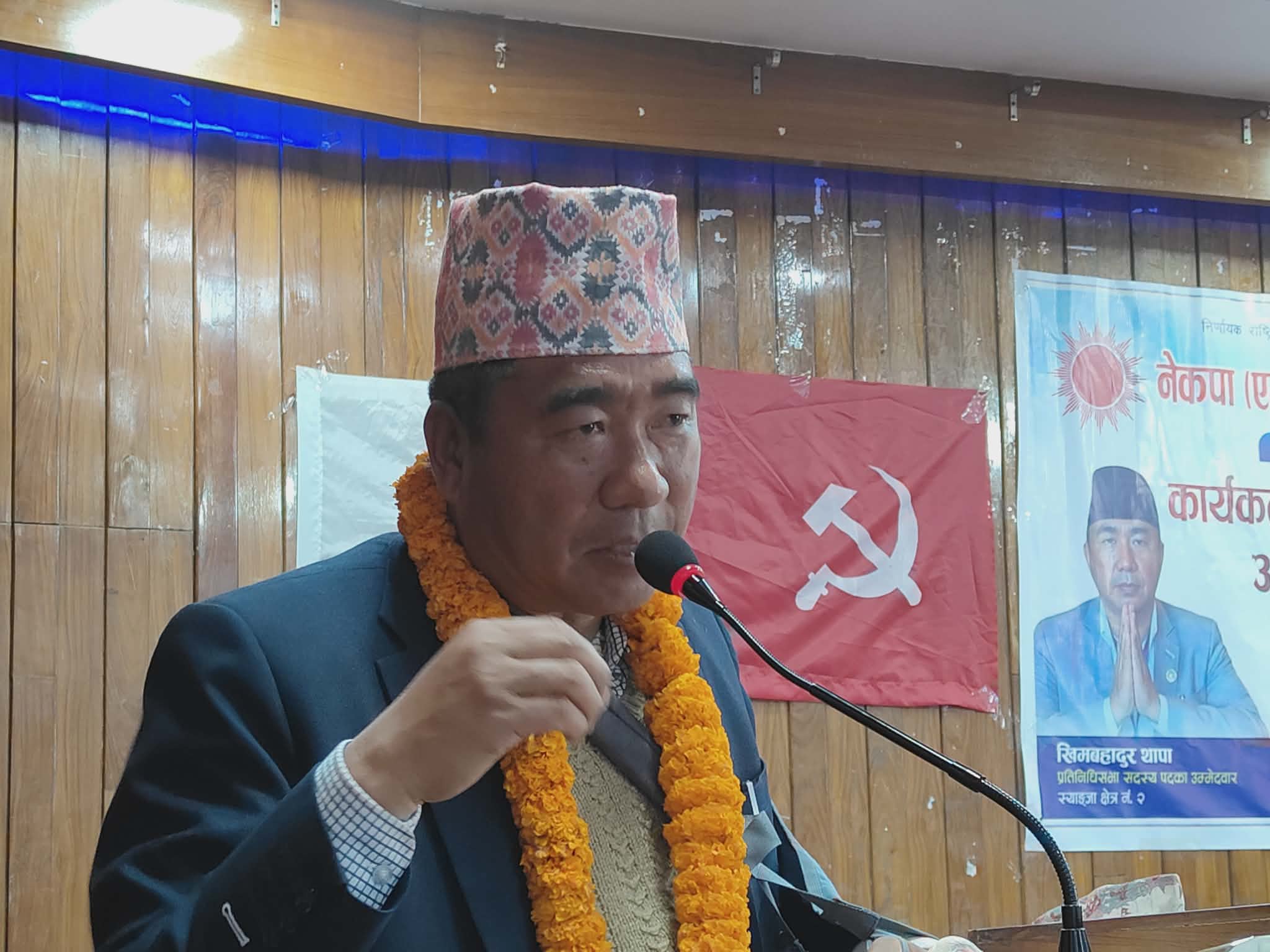 क्षेत्र नंं २ का उम्मेदवार खिम थापाले स्याङ्जा क्षेत्र नं. २ पितृले भोट हालेको क्षेत्रको रूपमा बदनाम भएको उल्लेख गर्दै त्यो दागलाई यस पटक एमालेले मेटाउने बताए। बताउनुभयो । ‘स्याङ्जा पितृले भोट हाल्ने जिल्ला हो भनेर बदनाम भइरहेको छ, त्यसलाई चिर्न एमालेले जित्नुपर्छ,’ उहाले भन्नुभयो ।कालिगण्डकी गाउँपालिकाको अध्यक्षबाट राजीनामा दिएर प्रतिनिधिसभा सदस्य निर्वाचनमा उम्मेदवार बन्नुभएका थापाले गाउँपालिकापछि सिङ्गो क्षेत्रलाई नै नमुना बनाउन आफ्नो उम्मेदवारी रहेको बताउनुभयो । मैले पालिकाबाट सबै जनताको निःशुल्क स्वास्थ्य बिमा सँगै शिक्षा, कृषि, सिँचाइ लगायतका क्षेत्रमा महत्त्वपूर्ण काम गरेको उल्लेख गर्दै त्यस्तै नमुना कामहरूलाई क्षेत्र र देशव्यापी बनाउने बताउनुभयो ।